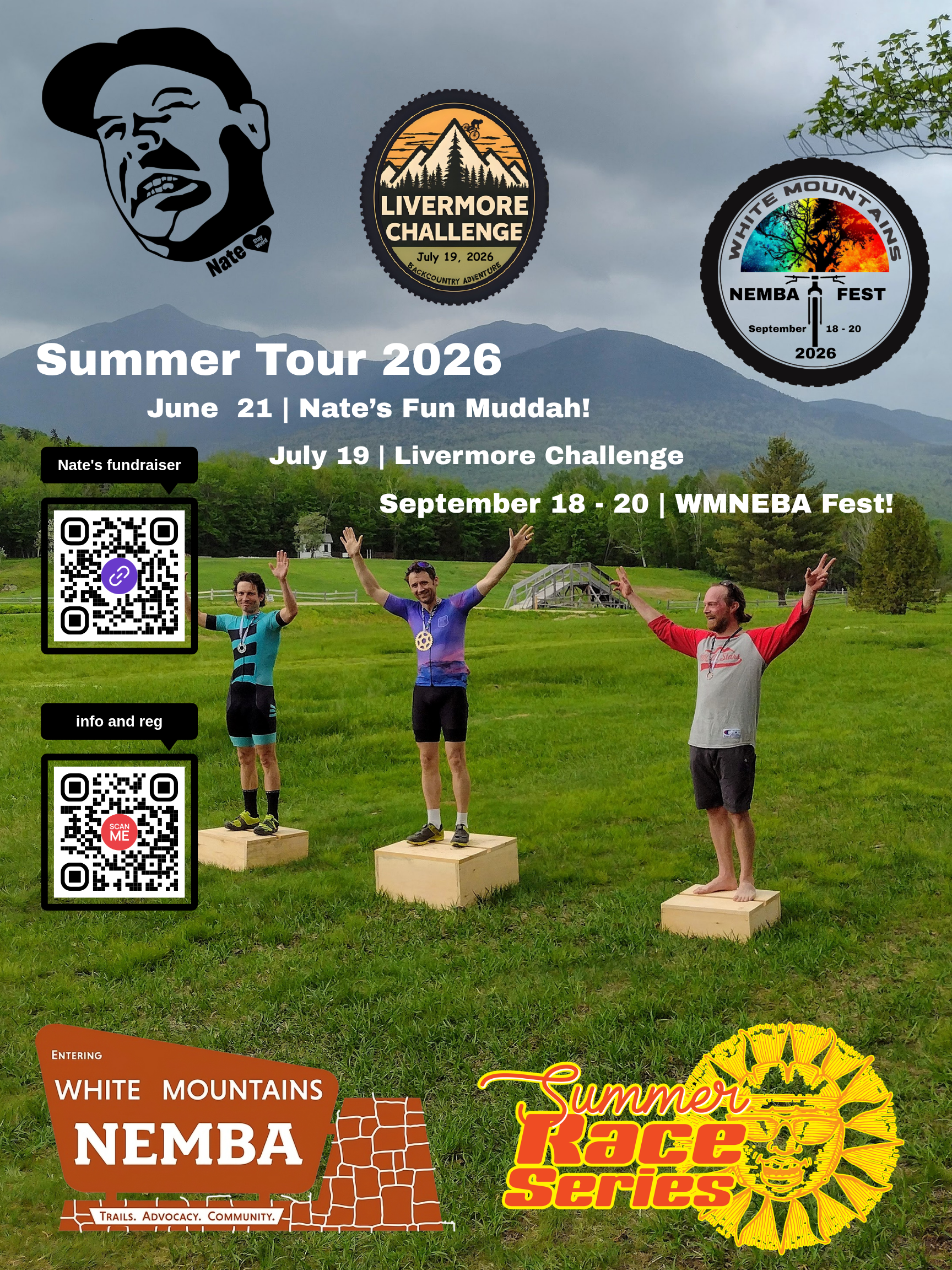 save the dates 6/21/2026 Nate's fun Muddah!, 7/19/26 The Livermore Challenge, 9/18 - 9/20 White Mountains NEMBA - Fest.